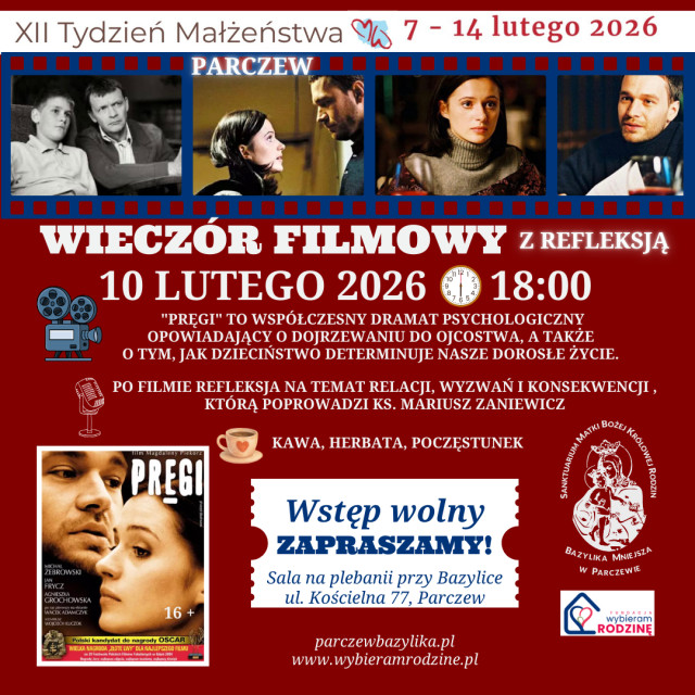 - We wtorek, 10 lutego br. zapraszamy na „Wieczór filmowy z refleksją”, tytuł filmu: „Pręgi” o godz.18.00 - prowadzący spotkanie ksiądz Proboszcz.