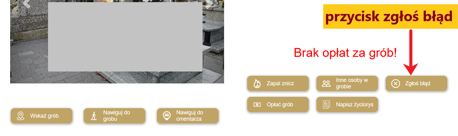 Jeżeli wyświetlany napis ,,Brak opłat za grób!" na Państwa internetowej karcie grobu jest błędny, czyli maja państwo potwierdzenie uiszczenia takiej opłaty dzierżawnej, prosimy zgłosić to przyciskiem ,,Zgłoś błąd", podając tam pełną i dokładną datę dokonanej płatności z otrzymanego potwierdzenia z kancelarii parafialnej.