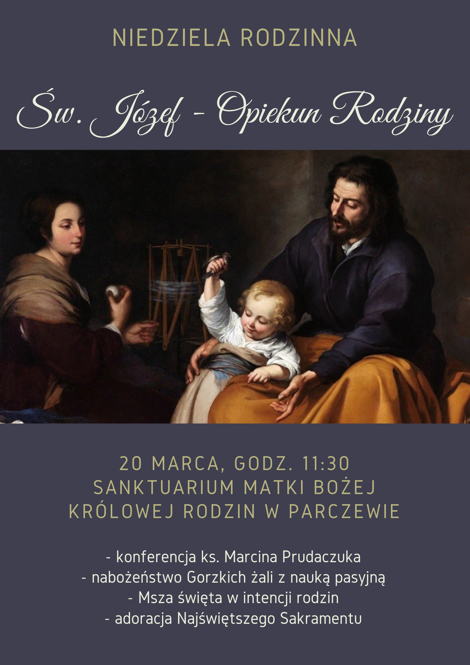 Odpowiadając na wezwanie Ojca Świętego oraz wychodząc naprzeciw potrzebom duchowym pielgrzymów przybywających do Sanktuarium Matki Bożej Królowej Rodzin w Parczewie, każda trzecia niedziela miesiąca to Niedziela Rodzinna, czyli czas szczególnej modlitwy za rodziny i z rodzinami. 20 marca odbędzie się kolejne z cyklu spotkań modlitewnych pod hasłem: Święty Józef – Opiekun Rodziny.