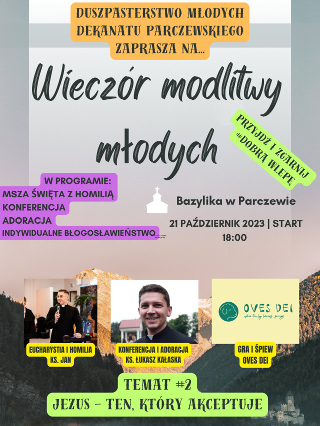 Serdecznie zapraszamy na kolejny wieczór uwielbienia w naszej parafii z zespołem Porozumienie+. Tym razem uwielbienie Bogu w Trójcy świętej oddamy 11 listopada w Dzień Niepodległości. Będziemy modlić się za nasz cały naród o potrzebne łaski i mądrość dla wszystkich z nas. Głosi ks. Jacek Nazaruk - proboszcz naszej parafii.